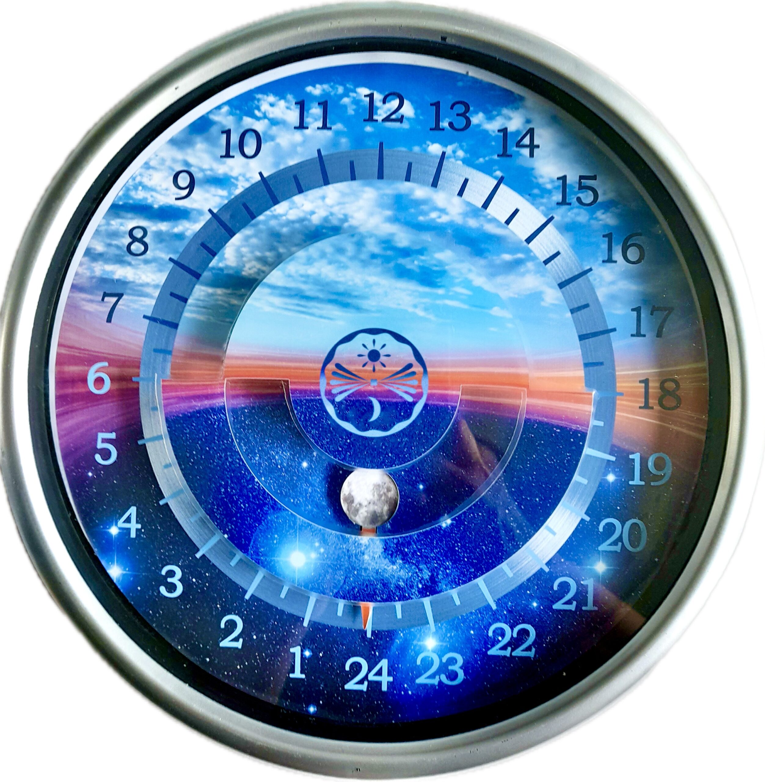 Egymutatós, gyermekeknek és felnőtteknek egyaránt szóló, látványában is tanító eszköz: nappal a Nap, éjjel a Hold mutatja az időt. A számlap mintázata és színátmenetei segítenek érzékelni a nappal és az éjszaka ritmusát. A mutató mindig az aktuális órához mutat, a fél órát a két szám közötti vonal jelzi. Ez az óra segít abban, hogy ne csak mérjük, hanem át is érezzük az idő múlását.